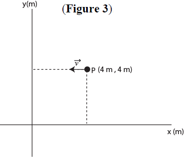 A particle moves horizontally in uniform circular motion in a horizontal xy plane. At one instant it moves through the point P at coordinates (4 m, 4 m) with a velocity of 6i− m/s and an acceleration of 12j m/s2 where i and j are unit vectors along x and y axes, respectively (Figure 3). Find the x and y coordinates of the center of the circular path. A) (4 m, 7 m)