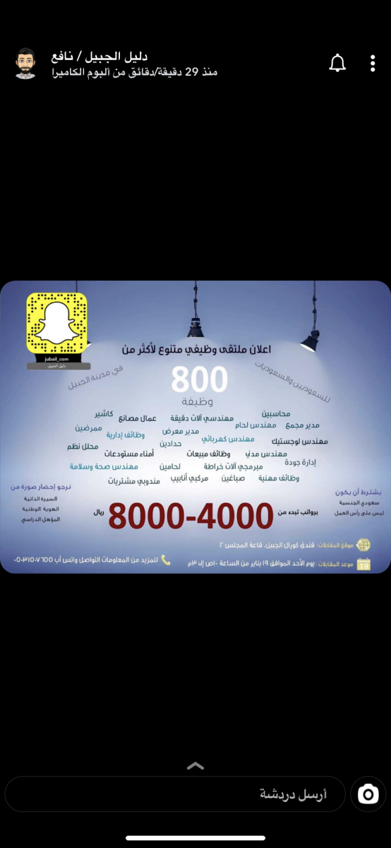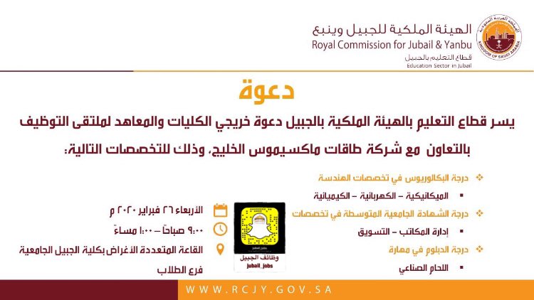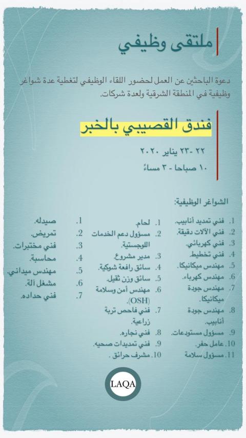 المقابلات يوم غدٍ الخميس الموافق 30-1-2020م في الثانوية الصناعية في الدمام من الساعة 3 عصراً حتى 7 مساءً