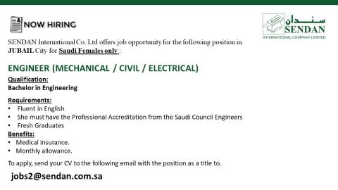 شركة سندان تحتاج مهندسات سعوديات حديثات التخرج في الميكانيكا، الكهرباء، والهندسة المدنية